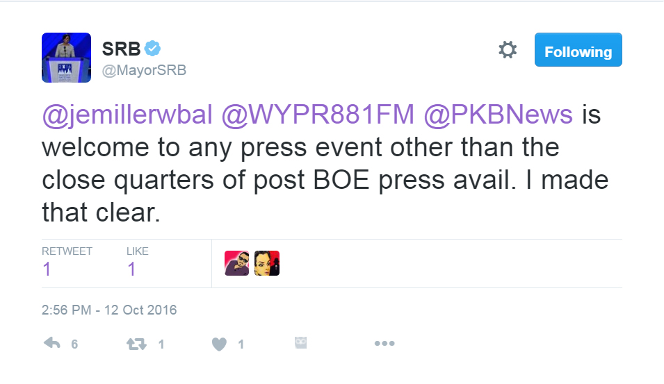 On Tuesday, Oct. 11, 2016, I was informed by Anthony McCarthy, director of public affairs for Mayor Stephanie Rawlings-Blake, that the mayor “declined to grant her discretionary access” to me to attend her post-Board of Estimates news conference “indefinitely.” As you will see in the notice (below,) there was no reason given.